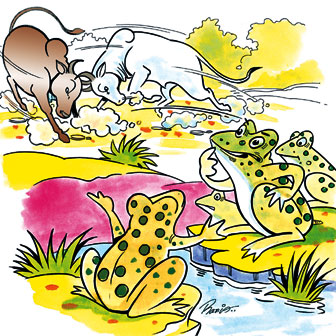 ஒருநாள் குளக்கரையில் சத்தம் கேட்டு, தவளைகள் பார்த்தன. குளக்கரையில் இரண்டு காளை மாடுகள் ஒன்றை ஒன்று முட்டி சண்டை போட்டுக் கொண்டு இருந்தன. நேரம் செல்லச் செல்ல அவற்றின் சண்டையும் சூடு பிடித்தது. தவளைகள் ஒன்றுக் கொன்று பந்தயம் கட்ட ஆரம்பித்து விட்டன.