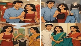 ‘தான் ஆசை ஆசையாக தேர்ந்தெடுத்துவைத்த புடவை, வேஷ்டி இரண்டையும் வாங்கமுடியவில்லையே..’ என்ற ஏக்கத்தோடு, கடையை விட்டு நிருதாவோடு வெளியேறினான் கிருஷ்ணன்.