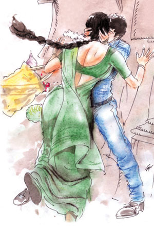 அந்தப் பையன் அதன் பிறகு அவளிடம் எதுவும் பேசவில்லை. நீண்ட காத்திருப்பின் பிறகு, சாக்குப் படுதாவை விலக்கி வெளியே பார்த் தான். தொலைவில் யாருமே இல்லை. அந்தக் கும்பல் போயிருந்தது. அவள் குனிந்து தனது காய்கறிப் பையை எடுத்துக்கொண்டாள். அவனுக்கு நன்றி சொல்ல வேண்டும்போல் இருந்தது. மெல்லிய புன்னகையோடு திரும்பி அவனை ஏறிட்டுப் பார்த்த போது, அவன் ஒரு நிமிடம்கூட யோசிக்காமல் அவள் தோளைப் பிடித்து இழுத்து, அவள் முகத்தைத் தன் முகத்தோடு பொருத்தி உதட் டோடு அழுத்தி முத்தமிட்டான்.