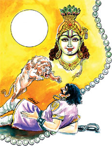 ஒரு நாள் பிரசேனன், காட்டில் வேட்டையாடி னான். அன்று ஏராளமான மிருகங்களைக் கொன்று குவித்தான். இந்தப் பாவச் செயலால் சியமந்தக மணியை அணியும் தகுதியை அவன் இழந்து விட்டான். அதனால் சிங்கம் ஒன்று, பிரசேனனைத் தாக்கிக் கொன்று தரதரவென இழுத்துச் சென்றது.