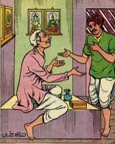 சிங்காரமும் அவனருகே போய் “இதோ பார். நான் வடிகட்டின கஞ்சன் என்று பெயர் பெற்றவன். அந்தப் பெயரை நான் காப்பாற்றி வருகிறேன். நான் எந்த வேலையையும் சும்மா செய்ய மாட்டேன். நான் உனக்கு ஏதாவது உதவி செய்ய வேண்டும் என்றால் அதற்கு பதிலாக நீ எனக்கு ஏதாவது கொடுக்க வேண்டும். உன்னிடம் ஏதாவது பணம் இருந்தால் கொடு. நான் தண்ணீர் கொடுக்கிறேன்!” என்றான்.