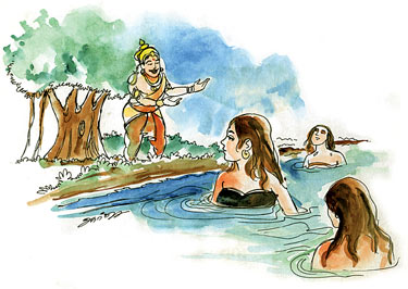 இந்த நிலையில் ஒரு நாள்… தன் தோழியருடன் பூலோகம் வந்த ஊர்வசி, தாமரைக் குளம் ஒன்றில் நீராடிக் கொண்டிருந்தாள். அவளைக் கண்ட புரூரவன், தனது நிலைமையை விளக்கி தன்னுடன் வருமாறு ஊர்வசியை அழைத்தான். அவன் மீது இரக்கம் கொண்ட ஊர்வசி, வருடத்துக்கு ஒரு முறை அவனைச் சந்திப்பதாக வாக்குறுதி தந்தாள். அத்துடன்… ஏற்கெனவே, புரூரவன் மூலம் கருவுற்றிருந்த ஊர்வசி, ‘ஆயுசு’ என்ற மகனைப் பெற்றெடுத்து, அவனிடம் கொடுத்துச் சென்றாள்.