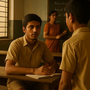 சற்றுக் கருமையான மயிர்க்கற்றை..மண்ணிற விழிகள்.சிரித்த முகம்..எமது ஆசிரியர் எனக்குப் பக்கத்து வாங்கில் அவனை அமரச் செய்தார், ஏனோ எனது இதயம் மிக வேகமாகத் துடிக்க ஆரம்பித்தது.அதனை அவனும் உணர்ந்திருக்கக் கூடும் என எண்ணினேன்.