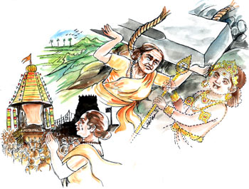 இந்த நிலையில் திடீரென்று தேர் நின்றது. ஆயிரக் கணக்கான பக்தர்கள் கூடி இழுத்தும், தேரை அசைக்கக் கூட முடியவில்லை. அப்போது, அங்கிருந்த பக்தர் ஒருவருக்கு ஆவேசம் வந்தது. ”என் பக்தை ஒருத்தி, தேருக்குப் பின்னால் கண் கலங்கி நிற்கிறாள். அவள் வந்து, வடம் பிடித்து இழுத்தால்தான் தேர் ஓடும்!” என்றார் அவர்.