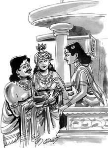 மறு கணம் அவள் தங்கக் கிண்ணம் ஒன்றில் குடிநீர் எடுத்து வந்து பவ்யமாகக் கொடுத்தாள். நீர் அருந்திய தருமர், பெண்மணியிடம் தங்கக் கிண்ணத்தை நீட்டி, ‘‘மிக்க நன்றி அம்மணி! இந்தக் கிண்ணத்தை பத்திரமாக எடுத்து வையுங்கள்!’’ என்றார்.