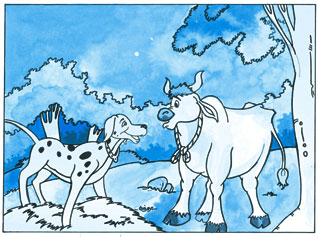 “”இது என்ன நியாயம்? நீ உறங்க வேண்டும் என்றால், வழக்கமான உன் குப்பை மேட்டுக்குப் போவதுதானே!” என்று மாடு கேட்டது.