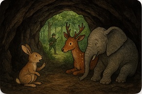 “ஒருநாள் நான் காட்டில் உள்ள ஆற்றில் நீர் அருந்திக்கொண்டிருக்கும்போது வேட்டையாடுவதற்காக அங்கு வந்த இளவரசர் என்னை பார்த்ததும் அவர் வைத்திருந்த அம்பால் என்னை தாக்கினார் அந்த அம்பானது எனது காலை பதம் பார்த்தது ஆனால் எப்படியோ அந்த வலியை தாங்கிக் கொண்டு எனது இருப்பிடத்திற்கு சென்று நடந்தவைகளை எல்லாம் என்னை அரவணைத்து வந்த யானையிடம் கூறினேன் அப்படி நான் கூறிக்கொண்டிருக்கும்போது பின்னாலிருந்து ஒரு குரல் கேட்டது யாரென்று பார்த்தால் அந்த இளவரசர் தான். என்னை தேடி என் இருப்பிடத்திற்கே வந்துவிட்டான், அப்போதும் என்னை தாக்க முயற்சி செய்தான். அதனால் எனது தந்தை (யானை) என்னைக் காப்பாற்றுவதற்காக இளவரசரை தாக்கிவிட்டு என்னை அந்த இடத்திலிருந்து விரைவாக கூப்பிட்டுச் சென்று விட்டார், பிறகு ஒரு இடத்தில் வைத்து என் அடிபட்ட காலிற்கு அங்குள்ள மூலிகை செடிகளால் வைத்தியம் செய்தார் எனது தந்தை. அப்போது தான் எங்களுக்கு இன்னொரு பிரச்சினையும் காத்துக் கொண்டிருந்தது, தந்தத்தால் தாக்கி உயிருக்கு போராடிக் கொண்டிருந்த அந்த இளவரசரை அவர்களது வீரர்களின் உதவியுடன் அரண்மனைக்கு எடுத்துச் செல்லப்பட்டார். ஆனால் எதிர்பாராதவிதமாக அவர் இறந்துவிட தனது மகனின் இந்த நிலைமைக்கு காரணம் ஒரு யானையும், மானும் என்பதறிந்த அந்த இளவரசரின் தந்தையும்,அந்நாட்டு மன்னருமான வேதன் மகாராஜா அவரது மகனை தாக்கிய யானையையும், அதற்கு காரணமாக இருந்த என்னையையும் அரண்மனைக்கு உயிருடன் கூப்பிட்டு வருபவருக்கு தக்க சன்மானம் வழங்கப்படும் என்று அறிவித்தார். அதனைக் கேட்ட அவரது பணியாட்கள்,வீரர்கள் என அனைவரும் எனது அப்பாவைத் தேடி காட்டிற்குள் இறங்கினர், என்னைக் காப்பாற்ற நினைத்த எனது அப்பா தானாகவே முன்வந்து அவர்களிடம் சரணடைந்தார். அவர்களும் எனது அப்பாவைப் பிடித்துக் கொண்டு அவர்களது அரண்மனைக்கு கூட்டிச் சென்றுவிட்டனர், மேலும் என்னையும் பிடிக்க வேண்டும் என்று அந்த அரசர் ஆணையிட்டதால் என்னையும் பிடிக்க சில ஆட்களை அனுப்பினார், அவர்களிடம் மாட்டிக்கொள்ளாமல் இருப்பதற்காக இந்த குகையினுள் தஞ்சம் புகுந்துக் கொண்டேன். ஆனால் எதிர்பாராத விதமாக இங்கேயே தங்கியிருந்த ஒரு அரக்கனிடம் மாட்டிக் கொண்டேன், அவனது பசிக்கு நான் தான் இறையாக கிடைத்துள்ளதால் என்னை சமைப்பதற்காக தேவையான விறகு, காய் போன்றவற்றை எடுப்பதற்காக என்னை கட்டிப்போட்டுவிட்டு வெளியே சென்று விட்டான்,அந்த நேரத்தில் தான் நீ என்னை காப்பாற்றினாய்”