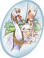 ஒரு நாள் பசியுடனும் களைப்புடனும் வனத்தில் உள்ள ஆலமரத்தடியில் அமர்ந்து இளைப்பாறினான். இந்த மரக் கிளையில், நாடீஜங்கன் எனும் தெய்வீகக் கொக்கு ஒன்று வசித்து வந்தது. இதன் மேனியெங்கும் பொன் ஆபரணங்கள்! கௌதமனைக் கண்ட கொக்கு, அவனைத் தன் விருந்தாளியாகவே எண்ணி வரவேற்று, அவனுக்கு உணவும் அளித்தது.