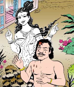 ஒரு திருடன், அருகில் கிடந்த பெரிய கல்லைக்கொண்டு, கண்ணன் தலையில் அடித்தான். தலையில் ரத்தம் பீரிட்டு, மயக்கமாகி கீழே விழுந்தான் கண்ணன்! தங்கச் செயினை பறித்துக்கொண்டு, இரண்டு திருடர்களும் ஓடி மறைந்தனர். கண்ணனுக்கு மயக்கம் தெளிந்ததும், “நம்மை யாரோ அடித்துவிட்டு செயினை பறித்துக்கொண்டு போய்விட்டனர். இங்கு விபூதி வாடை வருகிறதே! அருகில் ஏதேனும் கோவில் இருக்கலாம்… சென்று பார்ப்போம்!’ என்று நினைத்து, சிறிதுநேரம் சென்றதும், கோவில் அருகில் வந்துவிட்டோமென நினைத்தான்; தட்டுத்தடுமாறி தான் நடந்தான்.