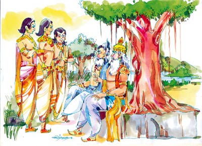 இதையடுத்து அனைவரும் பயணத்தைத் தொடர்ந்தனர். வழியில் பெரிய ஆலமரம் ஒன்று! அதன் நிழலில் பீஷ்மருடன் சென்று அமர்ந்தார் துரோணர்.